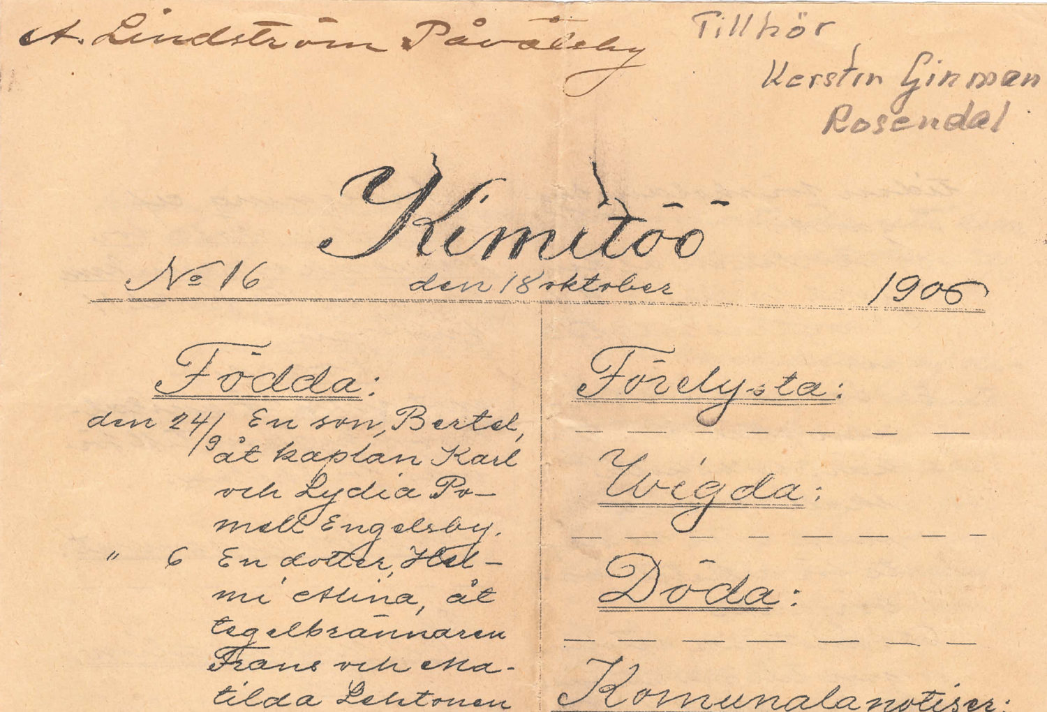 Under jubileumsfesten den 17 maj i Villa Lande var det en vänlig dam som ryckte mig i ärmen och ville överräcka ett kuvert. Damen var Kerstin Ginman från Rosendal. I kuvertet hade hon tre tidningar från år 1906 med namnet ”KIMITÖÖ”, jo så hette den. Hon hade kommit över de handskrivna tidningarna som ursprungligen hade adresserats till ”A. Lindström, Påvalsby”. Jag vill genast påpeka att denna Lindström inte hade något släktskap med släkten Lindström som senare blev Annonsbladets ägare.