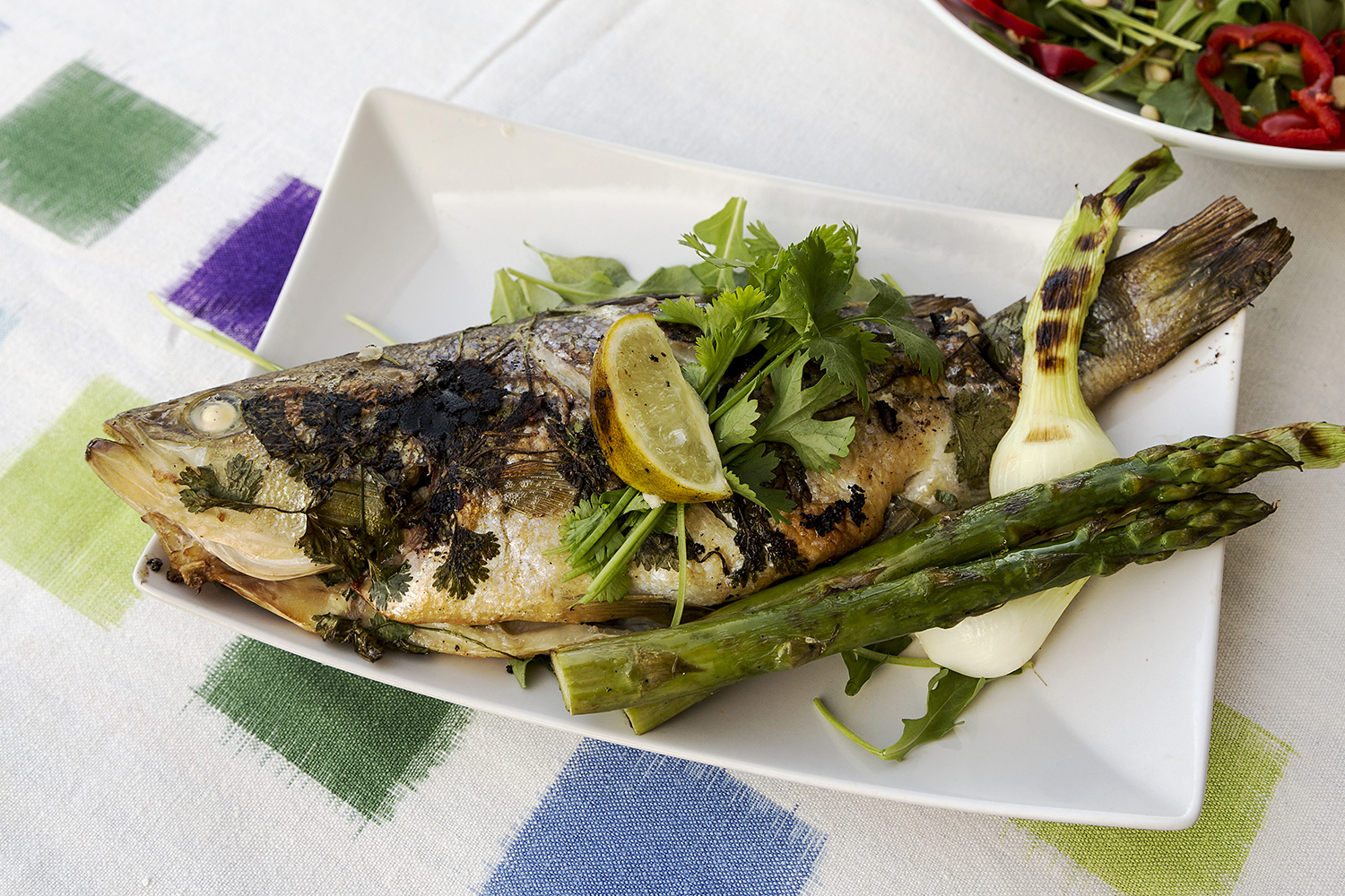På fisken görs ytliga snitt, på så sätt fås kryddan till köttet. Låt det ligga och dra sig i två timmar. Röks i ungefär tio minuter. Grillas i ungefär tio minuter, beroende på fiskens storlek.