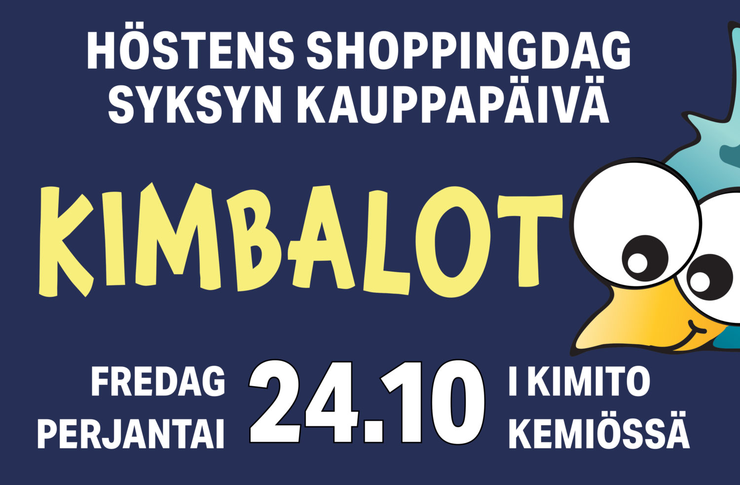 På fredag arrangeras åter Kimbalot i Kimito, 13 företag är med. De har olika erbjudanden och extra program, bl.a. representanter som berättar om produkterna. Mera om vad de erbjuder i annonserna i denna tidning. Med i år är K-Supermarket Kompass, OP Raseborg, K-Rauta, Somero Sparbank, S-Market, Teknikvaruhus Strandell, Engelsby Verk, MacDaniels Grill, Kimito Telefon, Rantalainen, Veikon Kone, Vahlbergs Varuhus, Aso parturi!