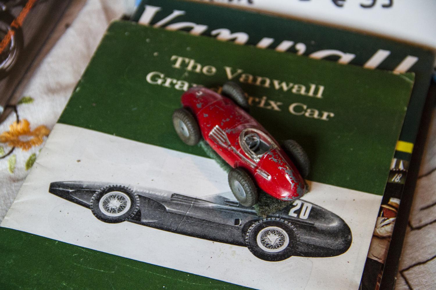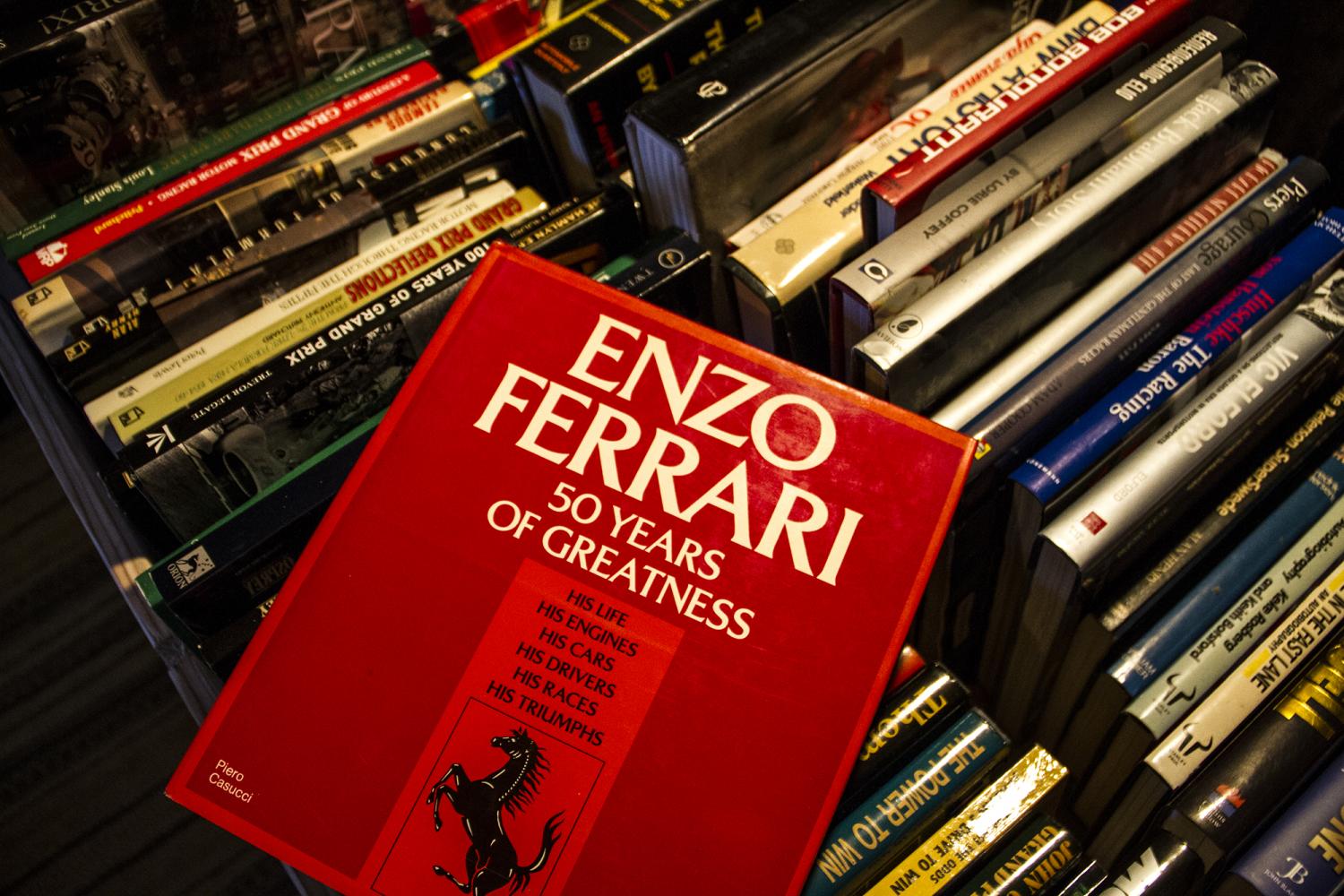 En röd rygg i en av boklådorna avslöjar Enzo Ferraris biografi, skriven av Piero Casucci. ”His life, his engines, his cars, his drivers, his races, his triumphs” lyder undertiteln. En tysk bok om den finske roadracinglegenden Jarno Saarinen är kompletterad med tidningsurklipp om hans liv före dödsolyckan i Monza 1973. Den svartaste dagen inom motorsporten finns nedtecknad mellan pärmarna på boken med det ödesdigra namnet ”Le Mans 1955” (året då Pierre Levegh körde av banan, så att 83 åskådare miste livet). Formelbilslitteratur ingår också i Laaksonens bokloppis. McLarens namn syns på flera pärmar och Bernie Ecclestones på en – förmodligen på flera, om man noggrannare skulle gå igenom böckerna.