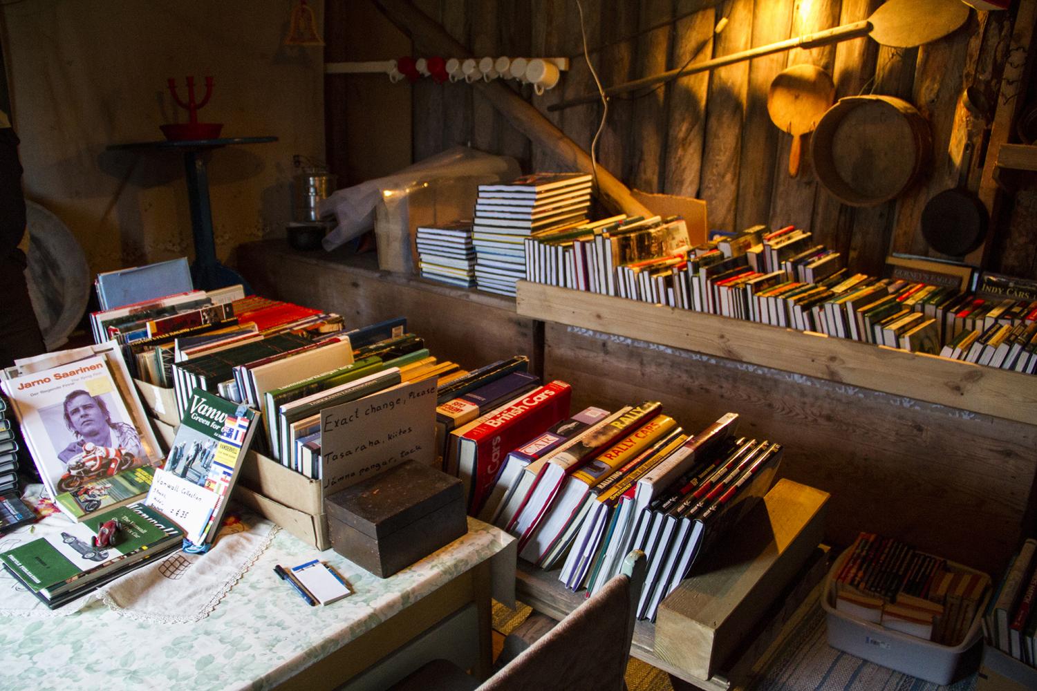 Ytterligare 1400 titlar som har med motorer och motorsport att göra ligger magasinerade annanstans på gården. Världshistoria och några teologiska band finns till salu i stugan bredvid. Laaksonen uppskattar att han allt som allt säljer cirka 3 000 böcker.
