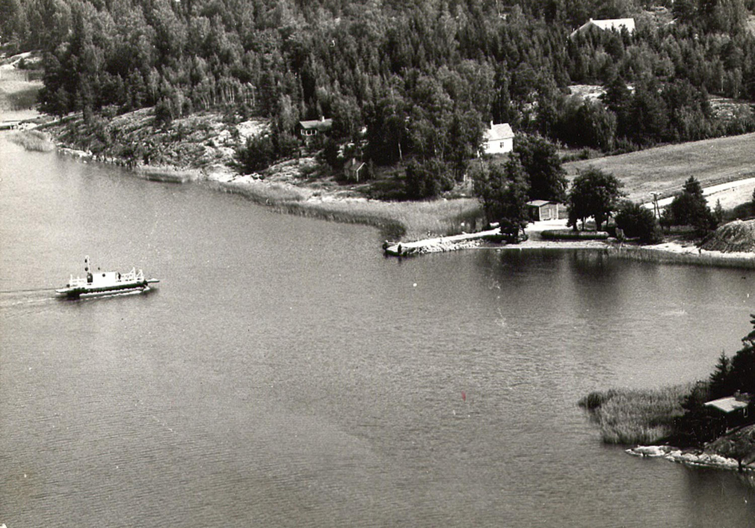 Bild från luften av Eknäsfärjan. (Tiina Holmbergs hemalbum)