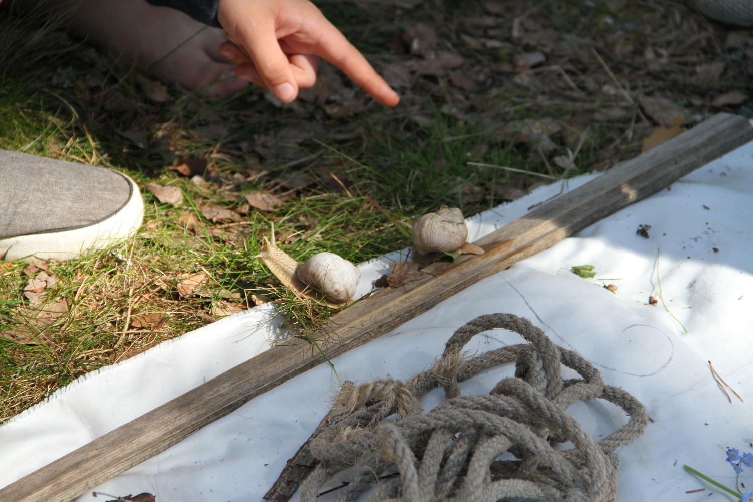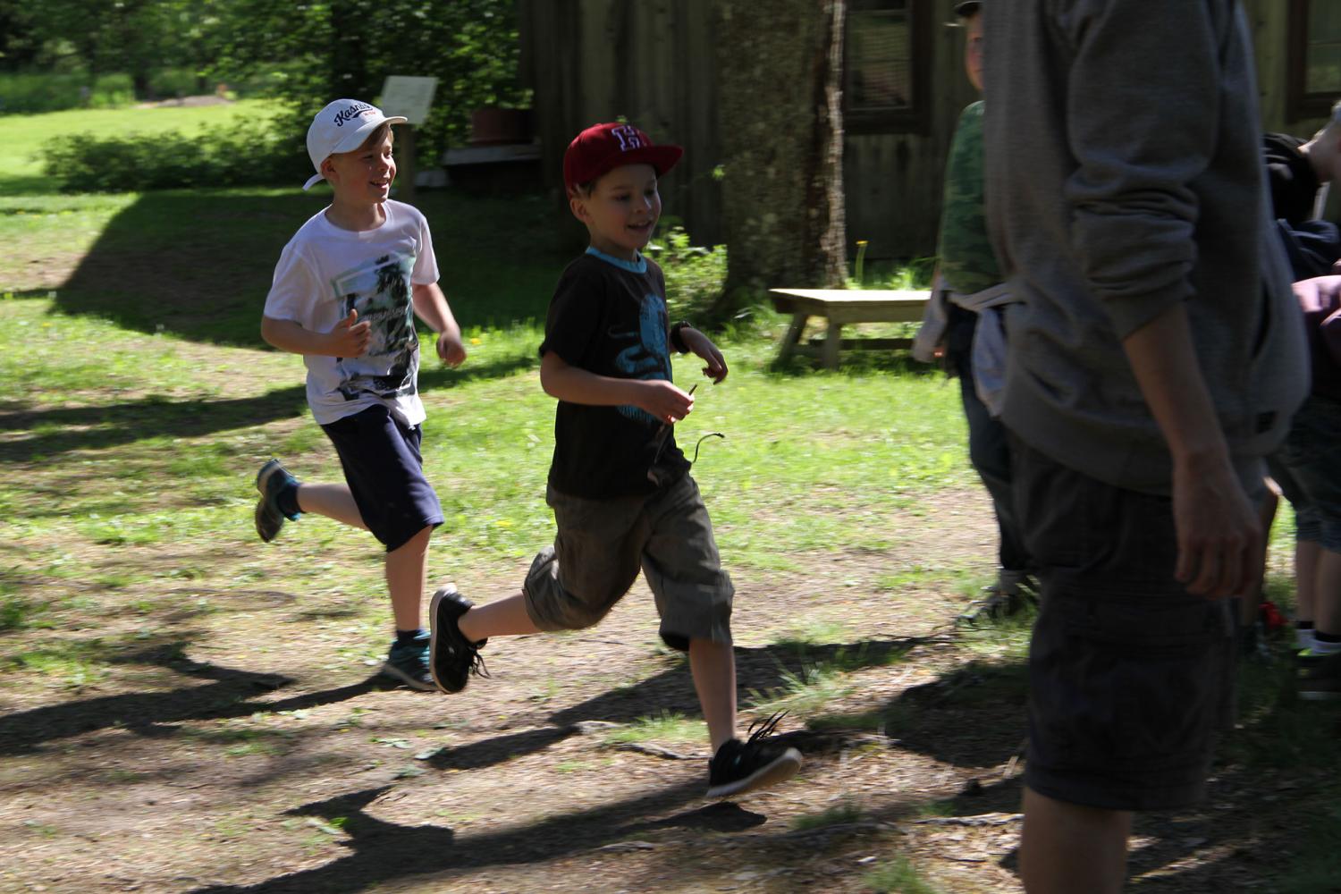 Lägrets program har börjat med att de sökt fram naturmaterial med olika egenskaper t.ex. något vasst och mjukt, och byggt en lägermaskot av dem. Lägerdeltagarna är finsk-, svensk- och tvåspråkiga barn i lågstadieåldern. En del av dem känner inte varandra från förut, men det verkar som alla redan har roligt tillsammans. Det blåser men annars är det soligt och skönt, som är bra eftersom största delen av programmet kommer att ske utomhus.