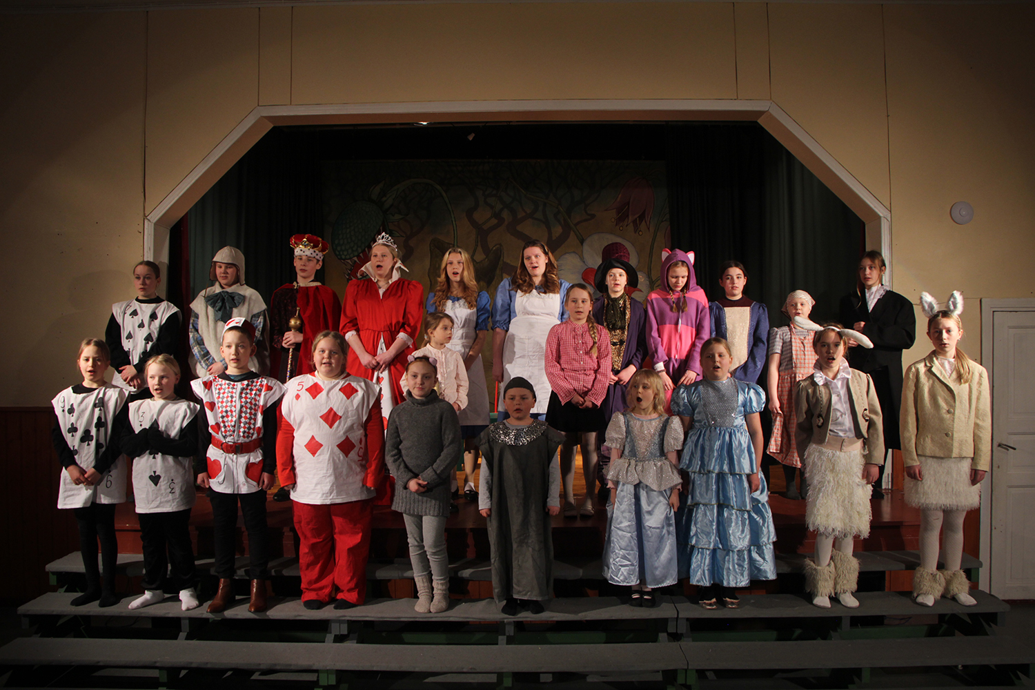 DEN HÄR gången ser vi ett trettiotal på scenen. Den stora huvudrollen som Alice spelas av Livia Rehn och Lina Malm och som Haren ser vi Liina Bruun och Tekla Grönroos. Regissörerna Ginlund och Väärä har alltsedan hösten jobbat med att få den stora skaran av allt från förstaklassister till nior att samspela och detta har lyckats. Också de yngsta, som i höstas kanske ännu höll på att lära sig läsa, spelar sina roller med inlevelse och man ser att hela ensemblen upplever gemenskap.