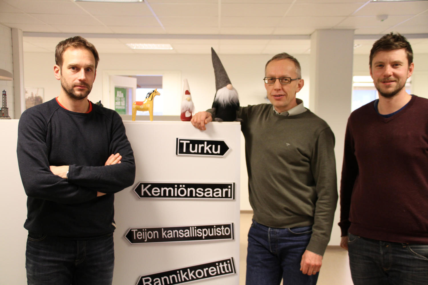 Melkein koko suunnittelutiimi: vas. Sven Ivars, Mats Nurmio ja Jonas Bergström. Kuvasta puuttuu Stella Törnroth.